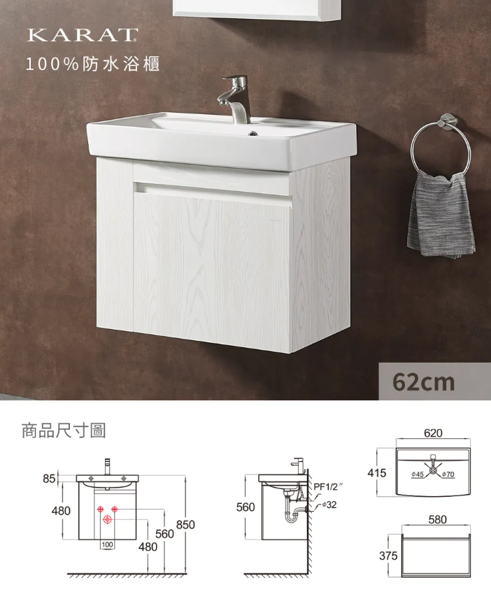 ● 浴櫃材質:實心PVC防水發泡板(白木紋)