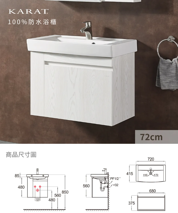 ● 浴櫃材質:實心PVC防水發泡板(白木紋)
