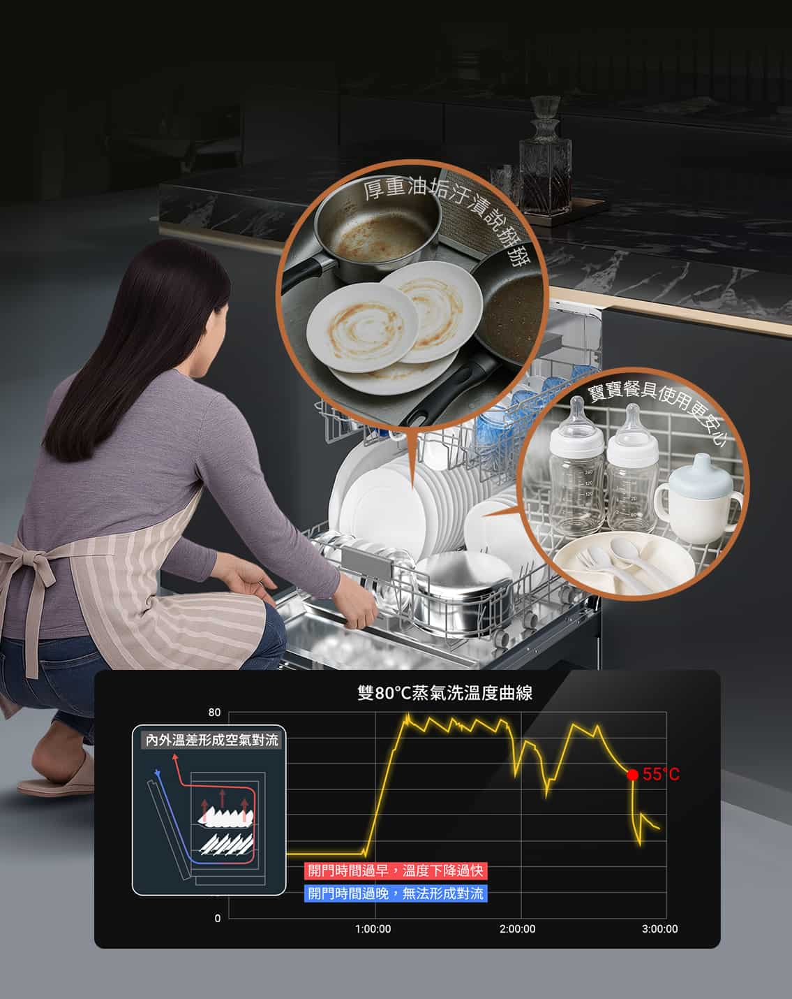 • 高溫蒸氣洗淨 : 80℃高溫蒸洗,瓦解油汙除去99.99%細菌